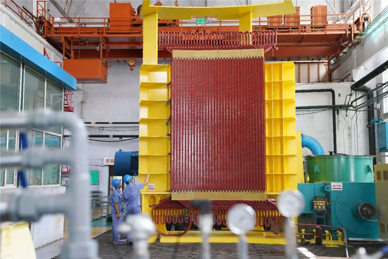 ↑哈電電機(jī)工人在介紹為研發(fā)白鶴灘百萬(wàn)千瓦水電機(jī)組而制造的仿真裝置(新華社記者王建威9月3日攝)。
